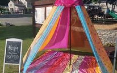 Our 5m rainbow bell tent and two glisteningly glittered and bejewelled sari tipi tents are available to hire with or without our entertainment services to light up and spice up your event aesthetics!
