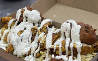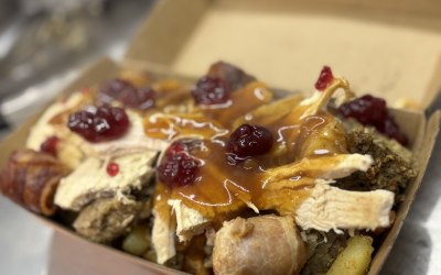 A mobile catering trailer serving burgers, loaded chips and fried chicken.