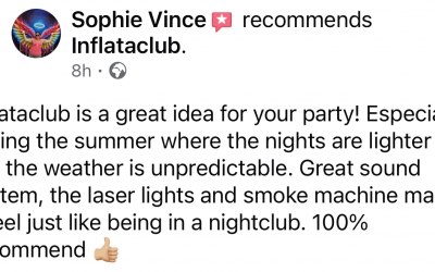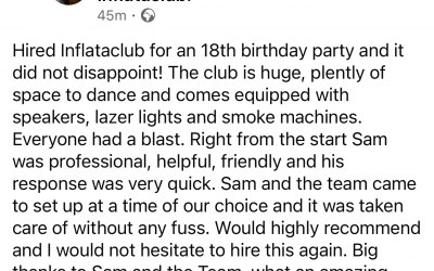 Included in every booking is our premium inflatable nightclub, professional sound system, club-level lasers and a smoke machine. The putting up and taking down is also included within the fee.