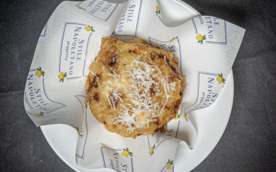 Authentic Neapolitan street food by Italian chef Renato Dalbon, serving crispy Frittatina Amatriciana, Four Cheese and Mushroom Frittatina, potato croquettes with smoked provola and homemade tiramisù.