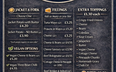 We’re a mobile jacket potato and gourmet hot dog van dishing up hot, fluffy spuds piled high with classic favourites and cracking vegan options.